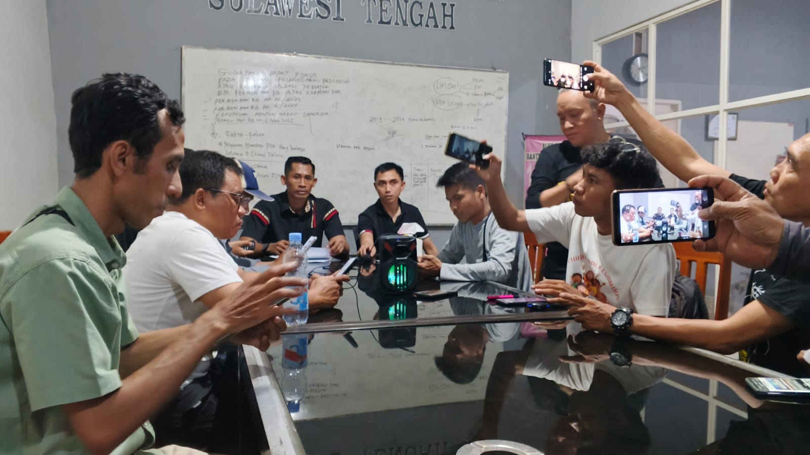 Direktur LBH Sulteng Julianer, memimpin jalannya Konferensi Pers didampingi dengan Kuasa Hukum LBH, Rusman, di ruang pertemuan kantor LBH Sulteng, Kota Palu, Jumat (12/12/2025) siang.